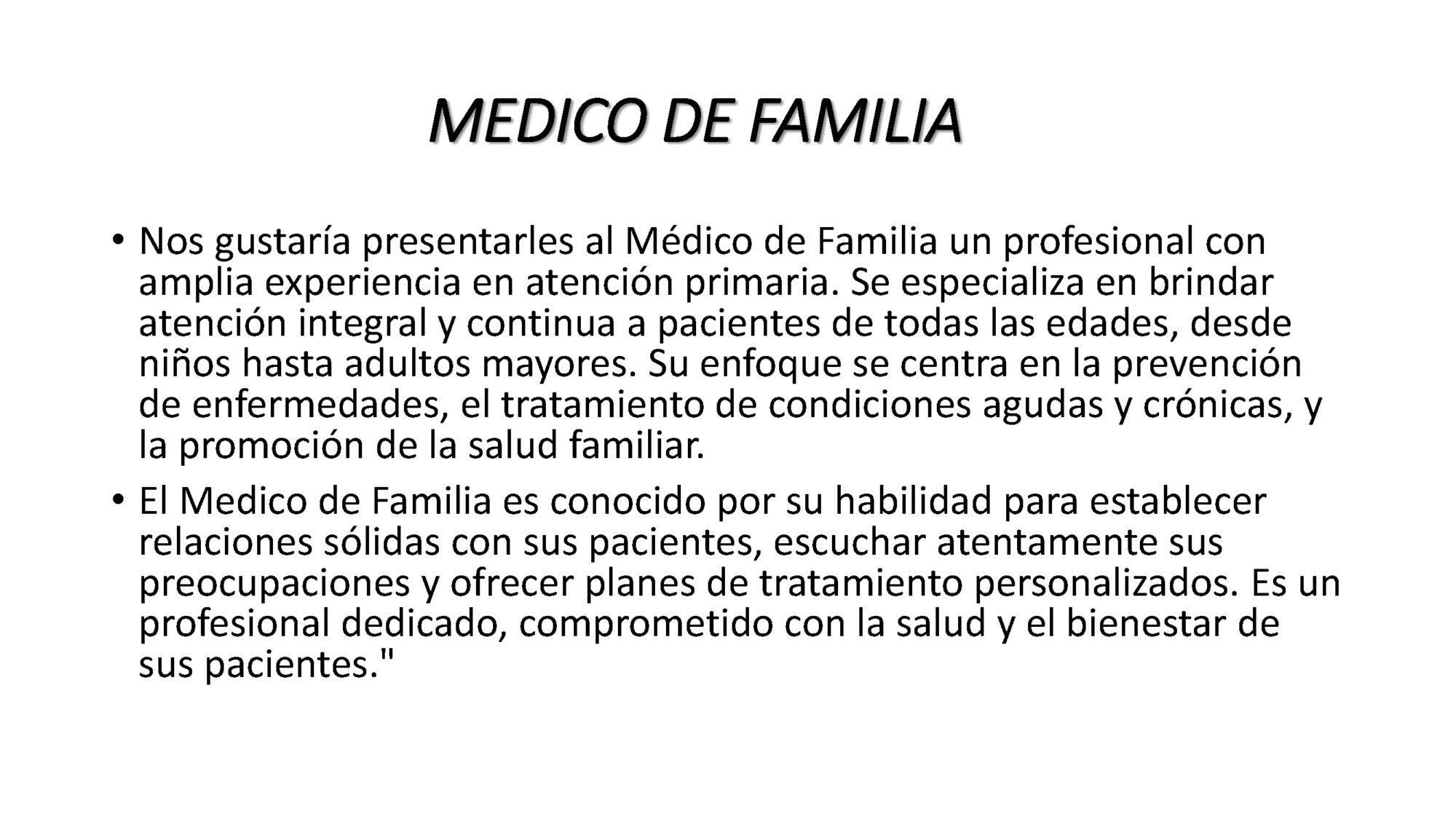 Nos gustaría presentarles al Médico de Familia un profesional con amplia experiencia en atención primaria. Se especializa en brindar atención integral y continua a pacientes de todas las edades, desde niños hasta adultos mayores. Su enfoque se centra en la prevención de enfermedades, el tratamiento de condiciones agudas y crónicas, y la promoción de la salud familiar.